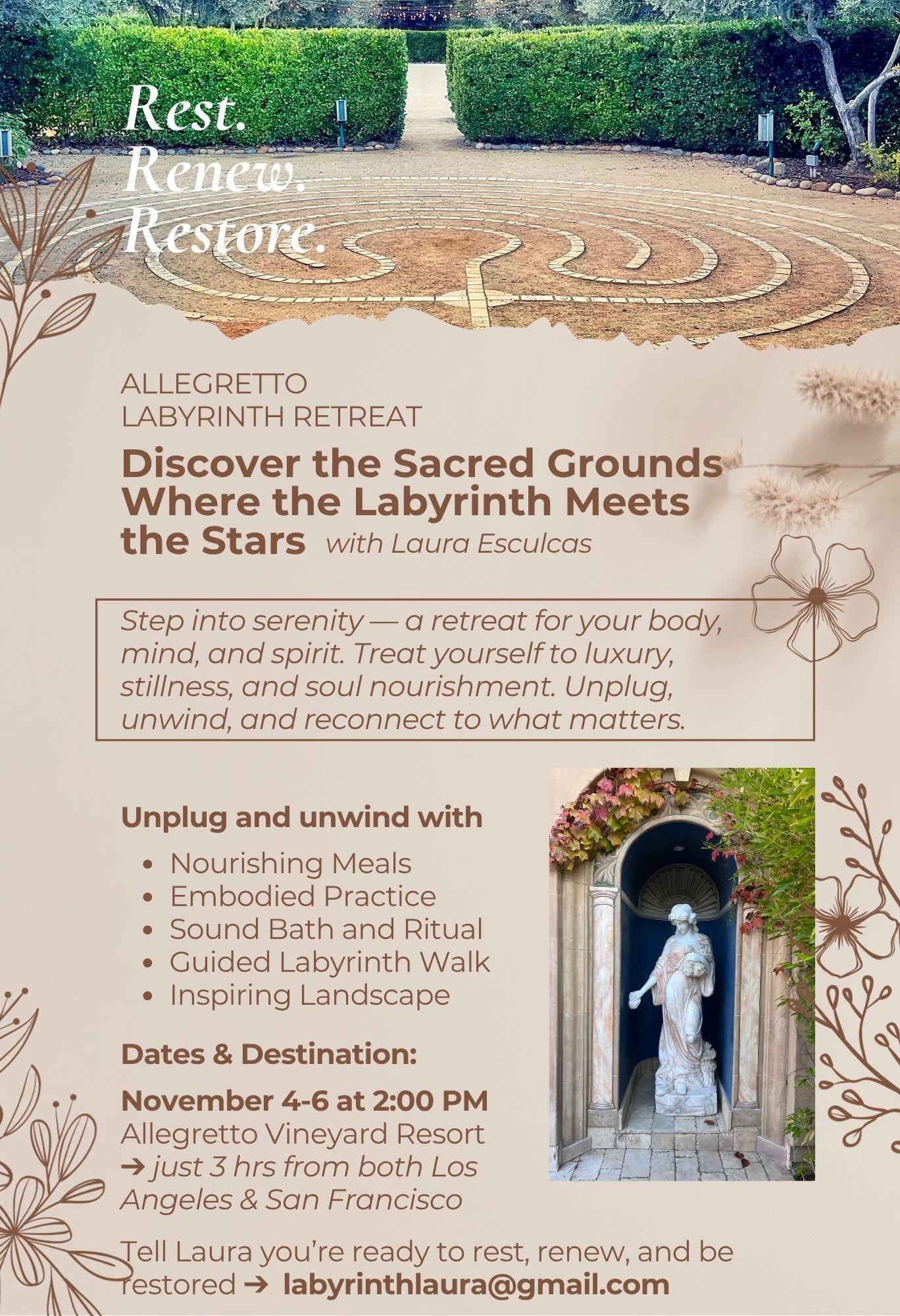 I’ve been invited to offer an immersive retreat experience at Allegretto Vineyard Resort in Paso Robles, California. With limited spaces left, we’re looking for a few soulful spirits to join us.